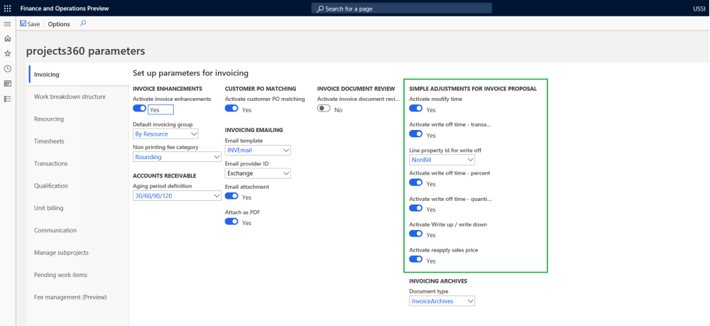 On projects360 parameter form, under Invoicing tab, a new set of parameters under the “Simple adjustments for Invoice proposal” has been introduced to control the adjustments on invoice proposal. User needs to set the field value to ‘Yes’ in order to use the different functionalities provided.