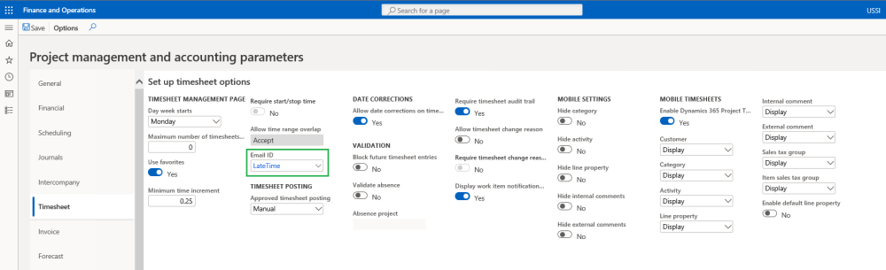 Project management and accounting > Setup> Project management and accounting parameters > Timesheet fast tab.