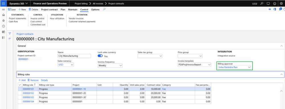 In prior versions, Billing approver had to be accessed via a button from the Project contract. Now it’s available on the Project contract details page. The functionality has not changed, it’s still available for Project billing workflows and as a Contract filter for BI scenarios.