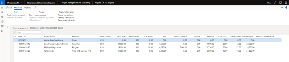 Fee management (preview) feature was introduced in the previous release with the ability to manage Time and Expense NTE, Progress and Fixed Fee project specifics focused on AEC industry. This new feature is using T&M revenue accrual concepts in order to track WIP and calculate % complete.