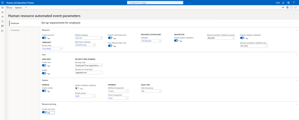 With HR Automated Events activated, every time the Worker is created with a base set of information, a set of HR events will automatically setup the tables listed above. This automated triggering of setups works when setting up a Worker via the UI, and/or when integrating new Worker records from Data entities or Dynamics 365 Talent. A New Parameters form is available to default setups and differentiate between Employee and Contractor setups. Since this functionality involves creating Users and assigning Security roles, there’s a special “HR automated events” security role required to modify the setups.