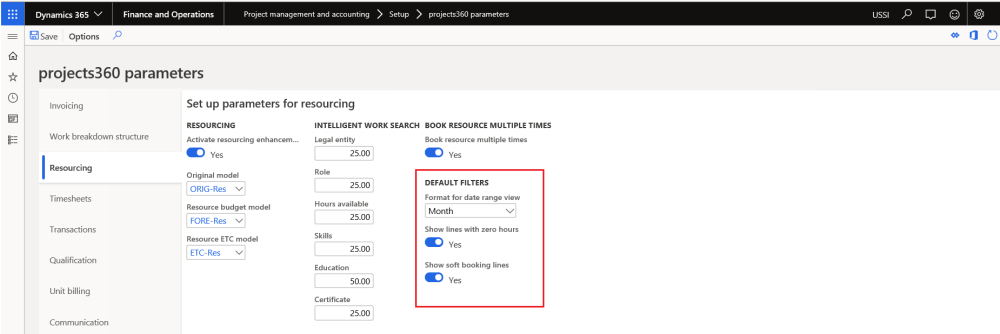 On projects360 parameter form, under Resourcing tab, a new parameters “Default filters” has been introduced to default the Format for date range view, Show lines with zero lines and Show soft booking lines onto Resource view and Project view forms.
