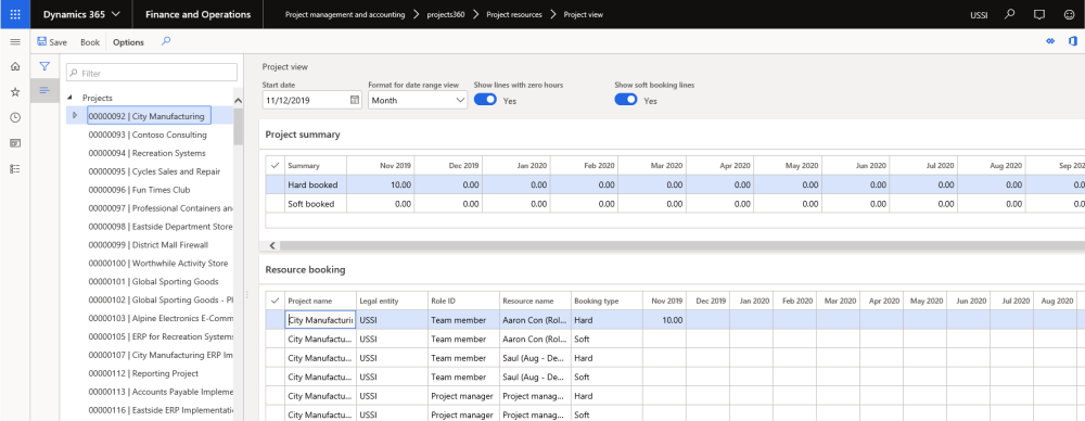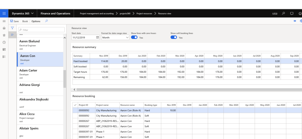 The resource view form displays the booking or utilization of resources across projects. The resource manager will be able to view all the resources and the work assigned to them in this form. A Resource or Project manager can view named resource bookings in this form.