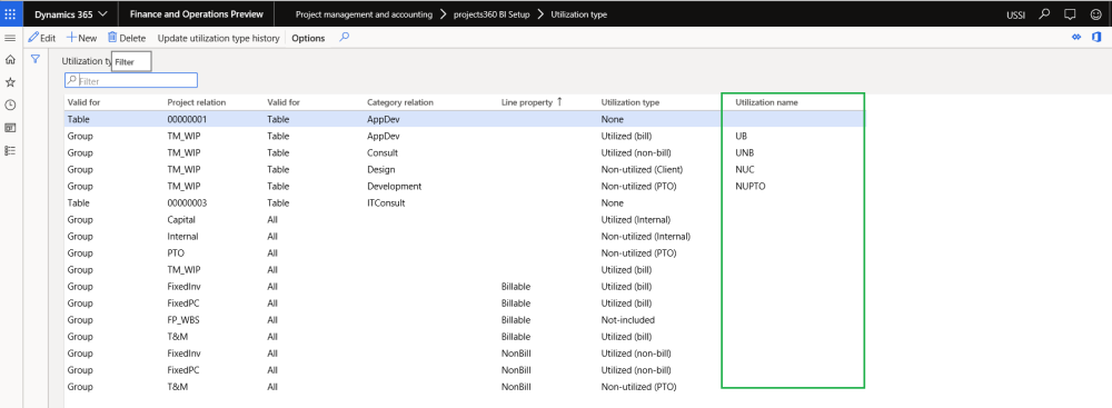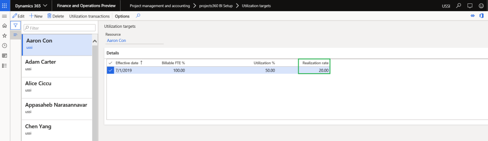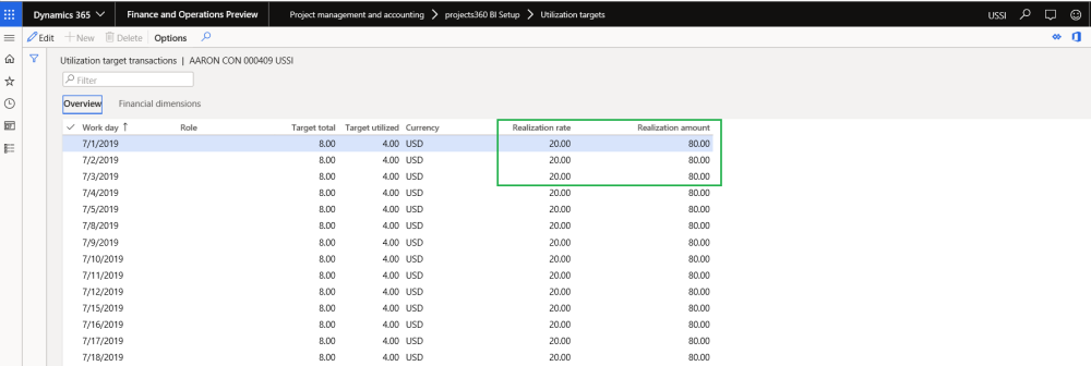Project management and accounting > projects360 BI setup > Utilization targets > Utilization target transactions button