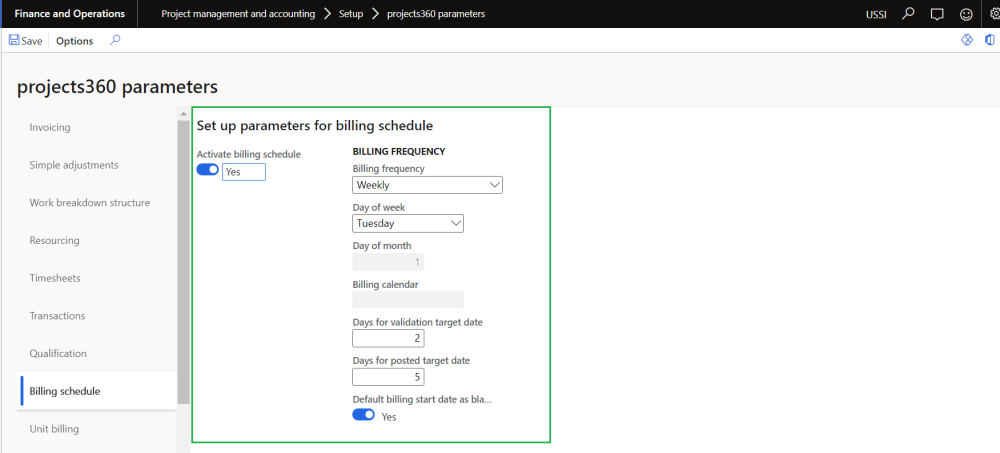 On projects360 parameter form, under billing schedule tab, a new parameter “Activate billing schedule” has been introduced to control the Billing schedule feature. When this checkbox is turned on ‘Yes’, the Billing schedule feature is activated.
