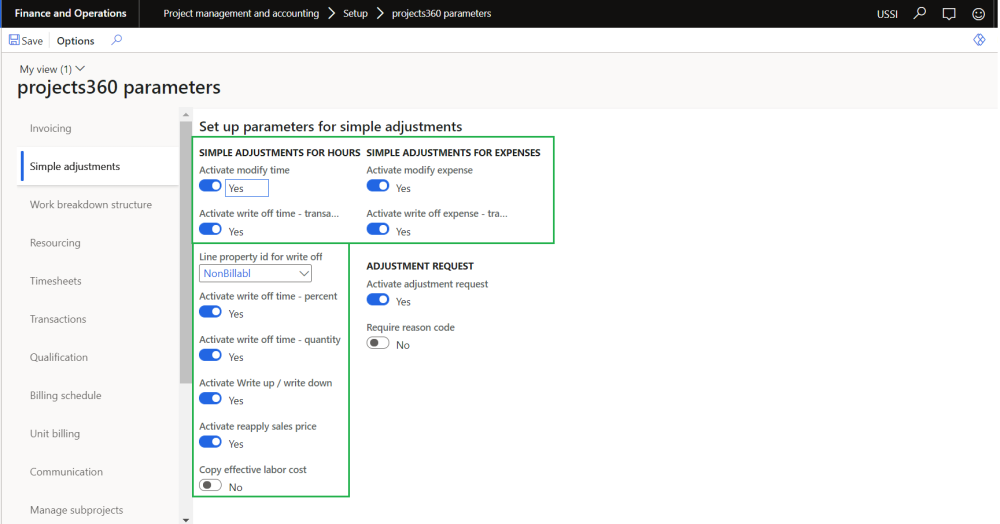 On projects360 parameter form, under Simple adjustment tab, a new set of parameters has been introduced to control the adjustments on the transactions and invoice proposal. User needs to set the field value to ‘Yes’ in order to use the different functionalities provided.