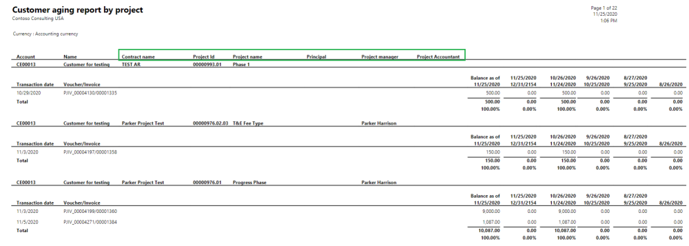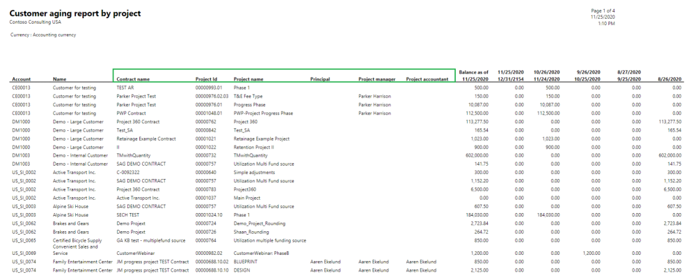 Apart from the standard fields, new fields like Contract name, Project ID, Project name, Project manager, Project accountant and Principal are added on the report. For each record the details will be displayed.