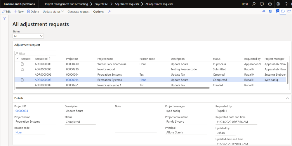Go to Project management and accounting > projects360 > Adjustment requests > All adjustment requests.
