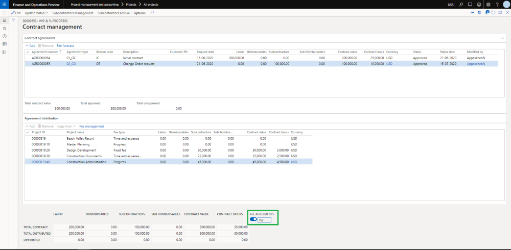 In this release we added the ability to view the contract total values based on the selected agreement line or for all contract agreement lines. This is will help users to quickly identify the undistributed contrat value from all the agreements.