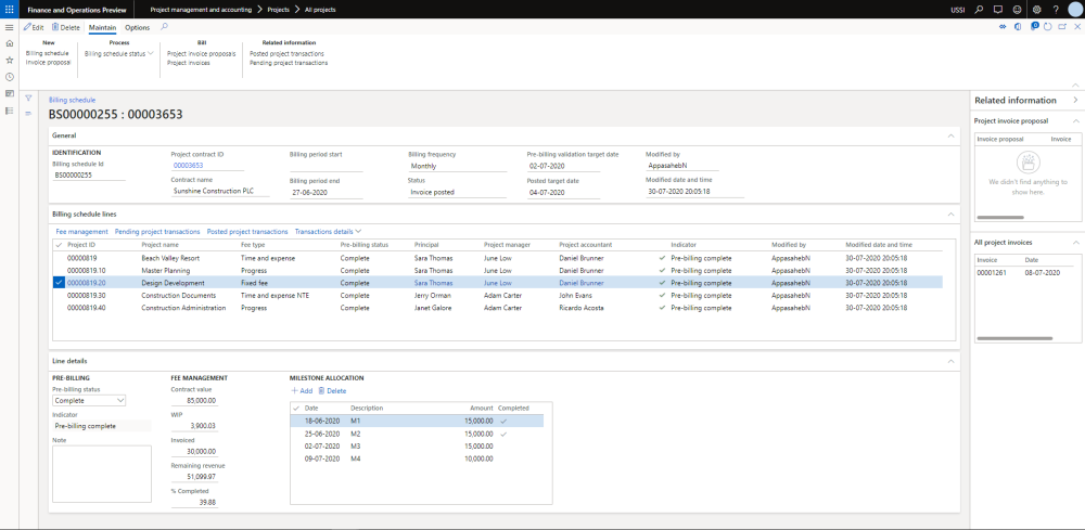 This new functionality creates a billing schedules automatically through a configurable batch job on billing dues dates defined on the project contract. Project managers and projects accountants then can review the details on these billing schedules and get the invoices proposals created from the same form once the details are verified and confirmed.