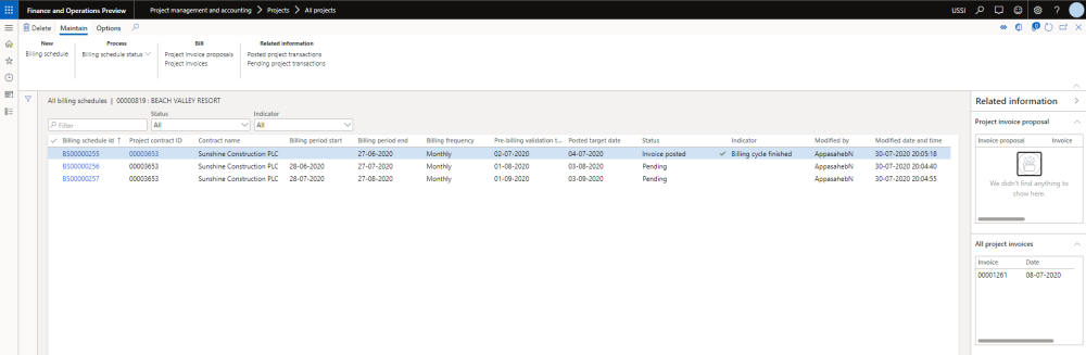 This feature also provides a single page to review the status for each billing period, from here users can see if the invoices has already been created, if its pre-billing complete but invoice proposal not created or if it still pending for some reasons for a particular billing period. There are various indicators to quickly identify the billing periods needing attention.