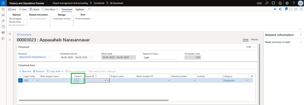 “Quick project search” is configured in the projects360 parameters form. Once you turn on the Quick Project Search feature, a new search icon lights up on Timesheets and Expense reports for you to use. You can now quickly search the project to submit time or expense and this provides a quicker experience in submitting time and expense for your employees.