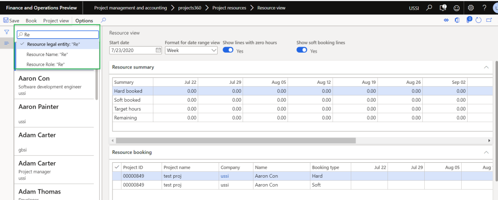 We have introduced additional filters ‘Name’, ‘Role’ and ‘Legal entity’ on the Resource view form to quickly search resource details. This feature is not controlled by the parameter.