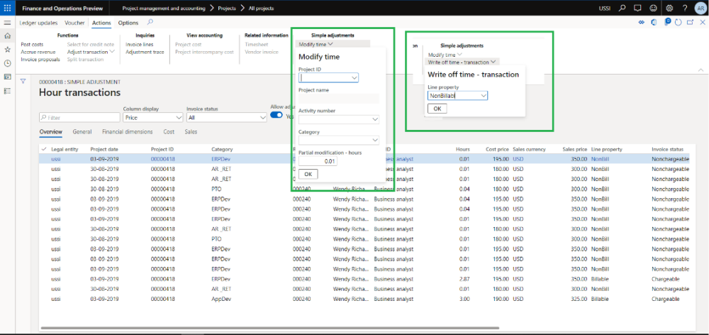This feature provides user the ability to perform adjustments on the hour transactions through transaction inquiry. User will be able to modify time, write off time fully or partially with the quantity of hours. This feature is controlled by the parameter.