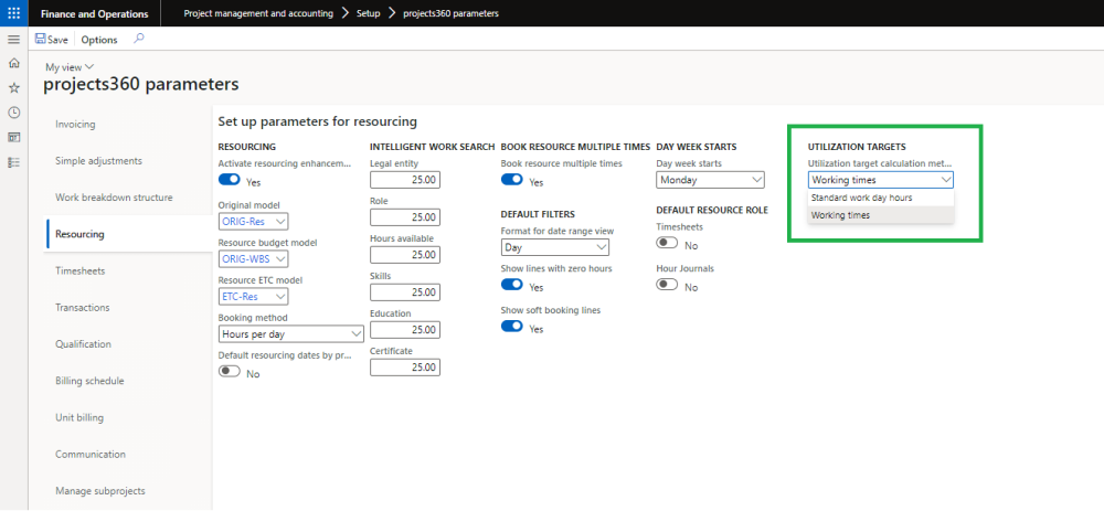 The Utilization target calculation has been enhanced to support various scenarios. Earlier utilization targets were calculated based on the standard work day in hours configured on the calendar. Now with the new enhancements, the utilization targets can be calculated based on the working hours for each day defined in the working times. The desired calculation can be chosen via a projects360 parameter.