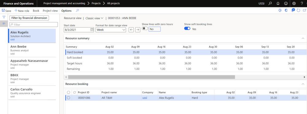 - Resource view is available as a separate form under projects360 > Project resources, where you will be able to see all resources and their project bookings.