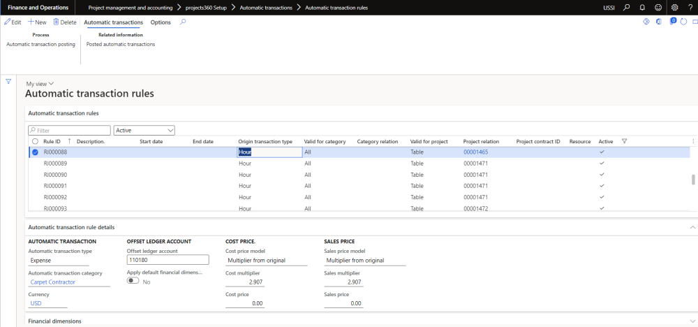Go to Project management and accounting > Project contracts > Project contract tab > Automatic transaction rules.