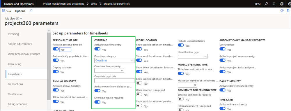 On projects360 parameter form, under Timesheets tab, a new set of parameters under the “Overtime” has been introduced to control the Overtime entry on timesheets. User needs to set the field value to ‘Yes’ in order to use the this functionality.