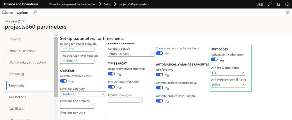 On projects360 parameter form, under Timesheets tab, a new parameter “‘Activate unit codes entry” has been introduced to enter unit code card on timesheets. User needs to set the ‘Activate unit codes entry’ field value to ‘Yes’ in order to use this feature.