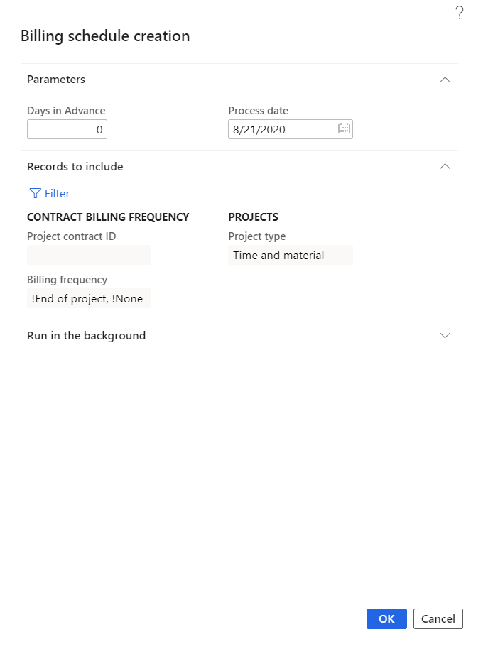 Billing schedule creation periodic process helps in creating billing schedule for a selected project contract or for all projects contracts. This process can be executed in batch as well.