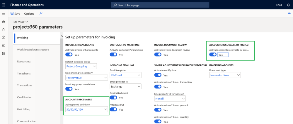 After posting the transactions/Invoices, the aging snapshot should be run. Contract open invoice and My open invoice list page will get updated after snapshot is run. Aging period definition on the Invoice aging snapshot form will default from the projects360 parameter.