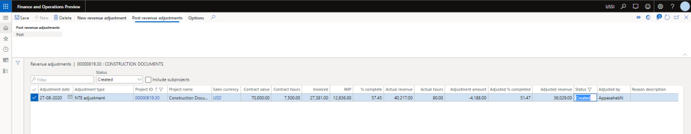 Once an adjustment record is created, user the modify the ‘Adjustment amount’ and ‘Adjusted % completed’ to adjust the project balances. On the modification, previously mentioned fields and the rest of the fields are auto calculated to reflect the right values. Once you sure of the adjusted values, you can post multiple revenue adjustments using button provided at the menu.