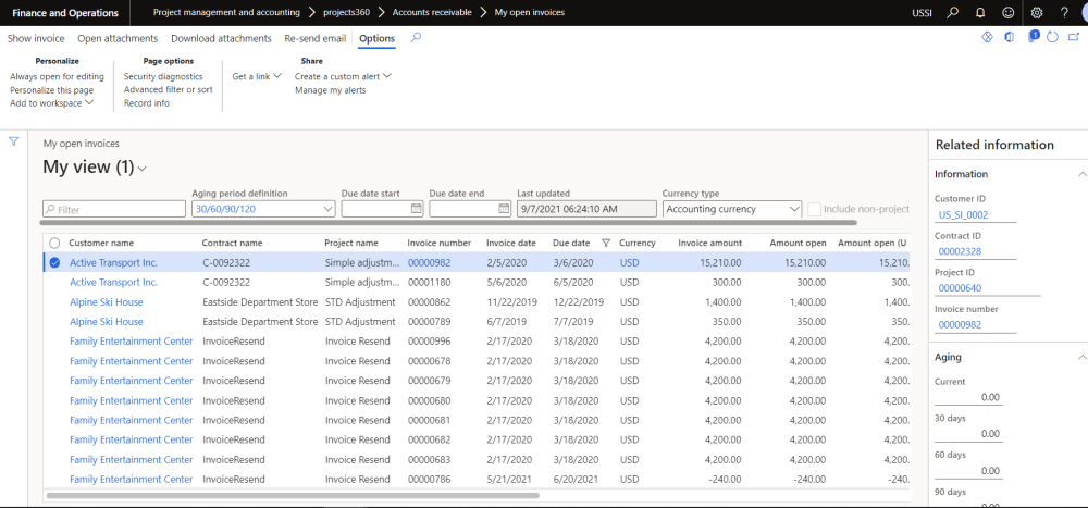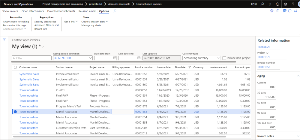 Once the aging snapshot is run from the periodic menu, project as well as non-project open invoices are populated on the contract open invoice list page.