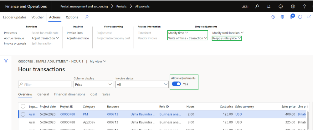 | Reapply sales price | User can reapply the sales price on the hour transactions. When sales price is reapplied ‘Sales currency’ and ‘Sales price’ only will be by default as ‘Yes’ while performing the sales price adjustment. |