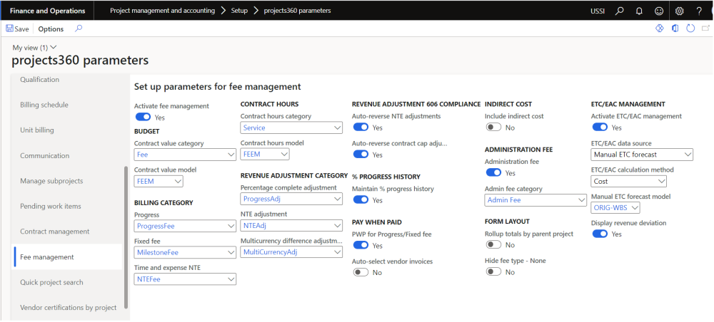| Rollup totals by parent project | If this parameter is set to Yes, then the values on the fee management form will rolled up to parent projects from their subprojects on fee management form. |