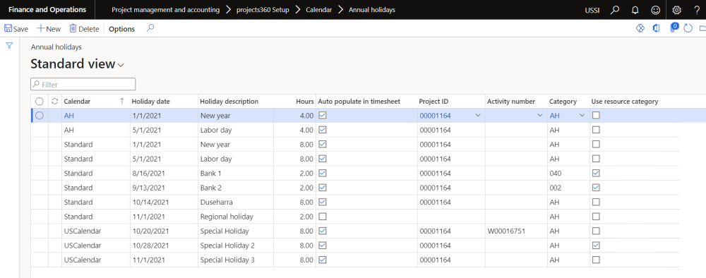 When the user set “Auto populate in timesheet” parameter to yes, annual holidays will get automatically populated on the timesheet with the Project ID and the category mentioned on the annual holiday setup form. This annual holiday record will be editable only when the “Allow timesheet line manual update” parameter is set to Yes on the parameters form. User will be able to remove these timesheet lines.