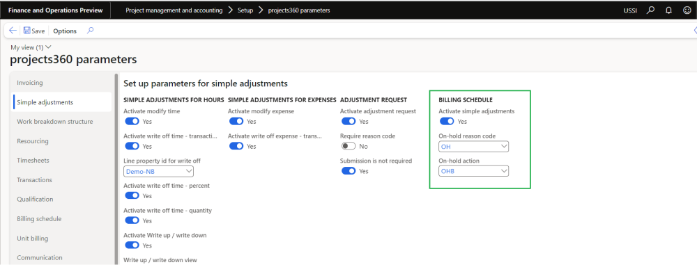 On projects360 parameter form, under simple adjustment tab, a new parameter “Activate simple adjustments” has been introduced to control the simple adjustment feature for billing schedules. When this checkbox is turned on ‘Yes’, the simple adjustments feature is activated on billing schedules.