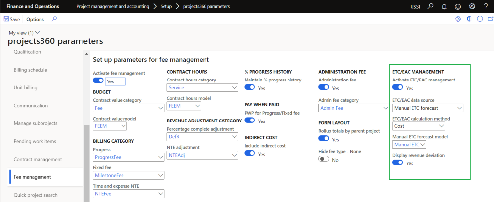 Go to Project management and accounting > All projects > Project contracts > Fee management tab > ETC/EAC management settings