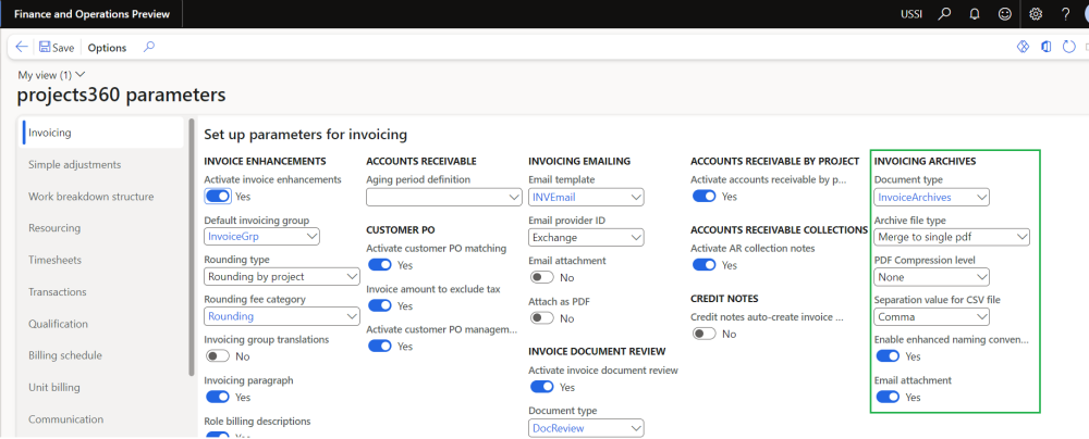Invoicing archives section has been added to projects360 parameters form to setup the document type. Document type fields needs to be selected on this form in order to use invoice archiving feature.