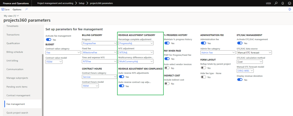 On projects360 parameter form, within the Fee management tab, few new parameters “Percentage complete adjustment” and “NTE adjustment” has been introduced. This fields allows us to configure the categories to be used while creating/generating the revenue adjustment records. User needs to set the “Activate fee management” field value to ‘Yes’ in order to use this feature. Along with activation, there are few more details need to filled in to use this feature, details of each field is provided in the table below the following visual.