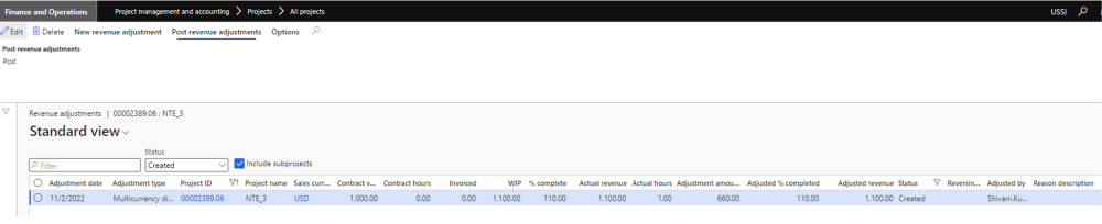 Once an adjustment record is created, the column values are auto calculated to reflect the right values. Revenue adjustment line will be displays using ‘Accounting currency’. You can update the reason description and can post adjustments using button provided at the menu.