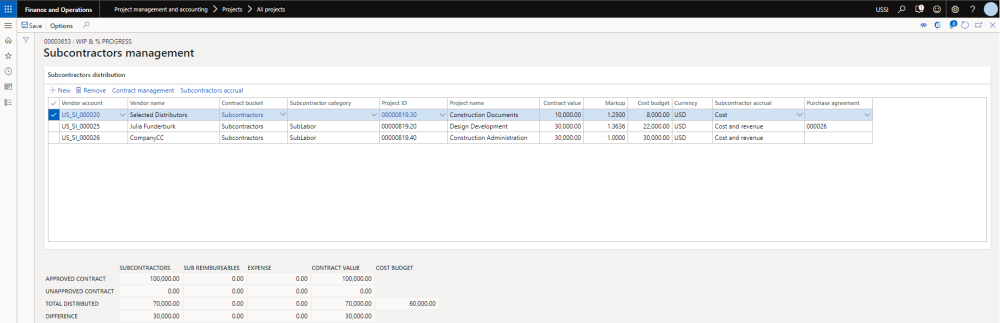 Once the Contracts agreements are created, these can be distributed for subcontracting using the new button or the form provided. The distribution can be among the multiple vendors or single vendor but multiple tasks/phases of the project. This form is divided into two sections, this grid allows to enter the subcontracting information while totals/footer section keeps displaying the latest values as and when makes changes in the grid.