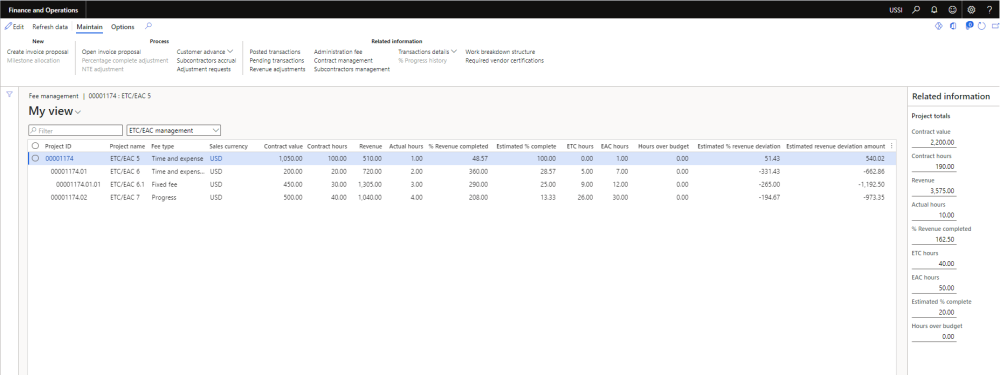 New view option “ETC/EAC management” is added on the existing Fee management form. This view option will be available when “Activate ETC/EAC management” parameter is set as “Yes”. New fields will be initialized only when the “ETC/EAC management” view option is selected on the Fee management form. New menu item is created to open and initialize the “Fee management” form directly as “ETC/EAC management” on the projects form.