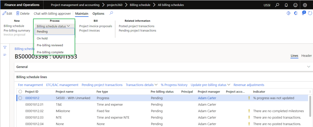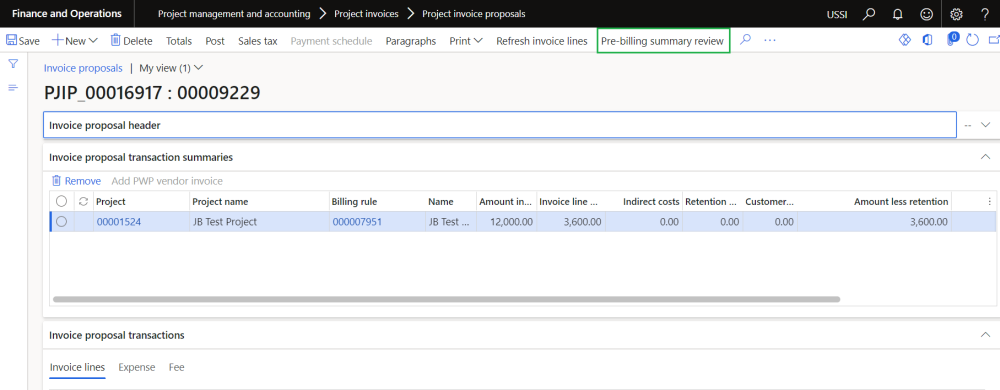 On the “Project invoice proposal” form, “Pre-billing summary review” is been added to access any “Pre-billing summary” report already generated during billing schedule. This button is available only for “Invoice proposals” created from billing schedule.