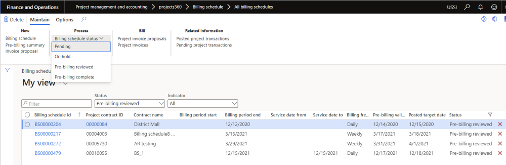 Now with this new enhancement, users are allowed to select multiple records and update the billing schedule status at once. The multi selection option is only available when the billing schedule “Status” filter is different than “All”.