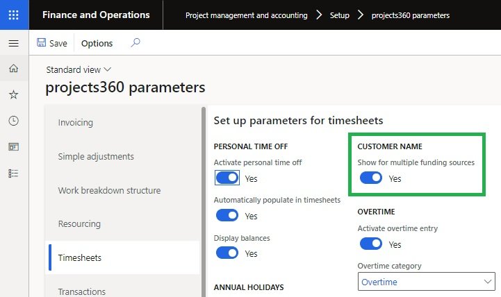In this enhancement, if the project contract has multiple funding sources, then “Customer name” related with “Customer account” from the Project will be shown on “Timsheet” and “Timesheet line level approval form”. This is controlled through a parameter.