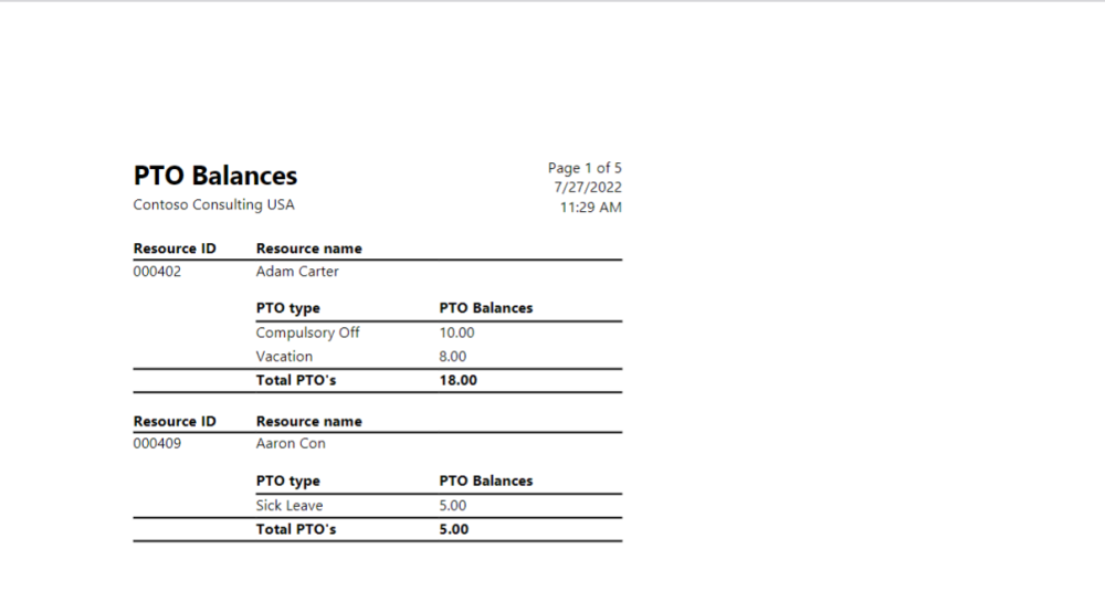 In this enhancement, new report “PTO balance report” is developed which displays the PTO balances of all the resources.