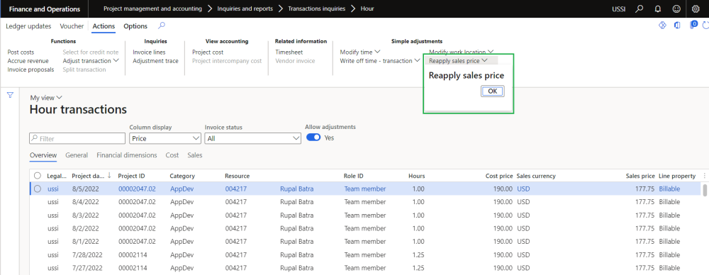 In this enhancement, “Reapply sales price” button is added on the “Hour transactions” form where users can perform reapply sales price similar as from Invoice proposal.