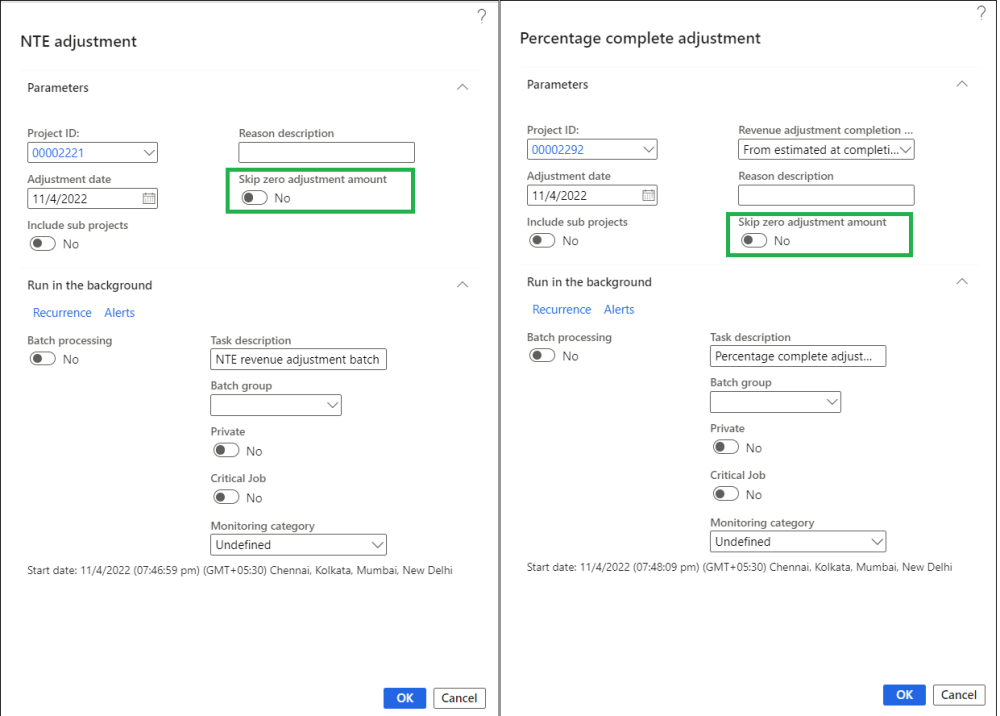 Enhanced the revenue adjustments to skip creating the reversal adjustment for “606 revenue compliance” if the overall adjustment amount will be zero. This enhancement is available for NTE adjustment as well as for Percentage complete adjustments when “606 revenue compliance” is activated.