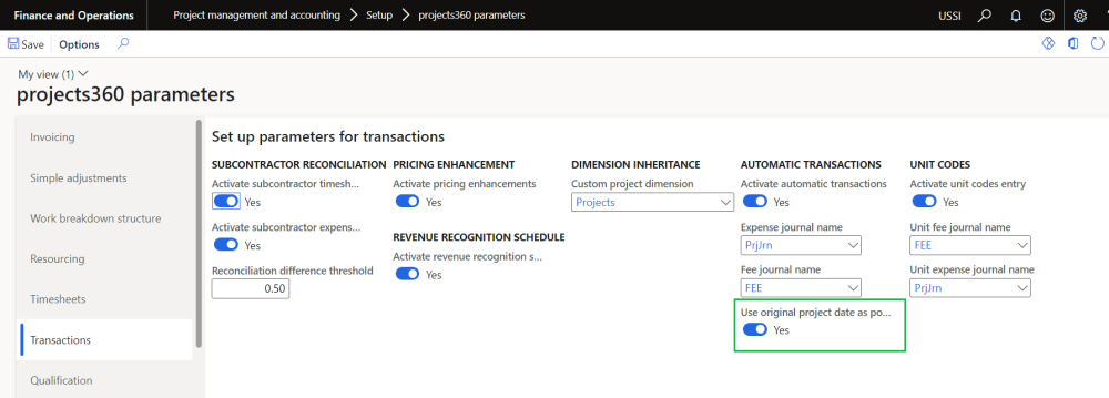 In this enhancement, new parameter “Use original project date as posting date” will allow users to use the “Project date” from original transactions as the “Posting date” when automatic transactions are generated.