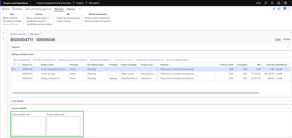 Billing schedule is enhanced adding “Invoice header” and “Invoice footer” fields. Both fields will be later used to default values at the invoice proposal level.
