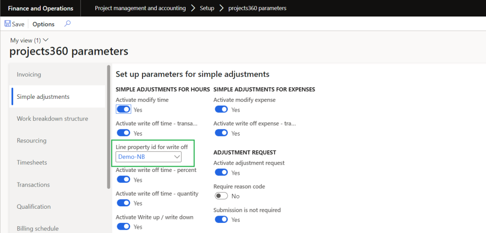In this enhancement, simple adjustments applied to transactions created through “Automatic transactions” will use the proper line property defined in “Line property id for write off” parameter in “projects360 parameters” form.