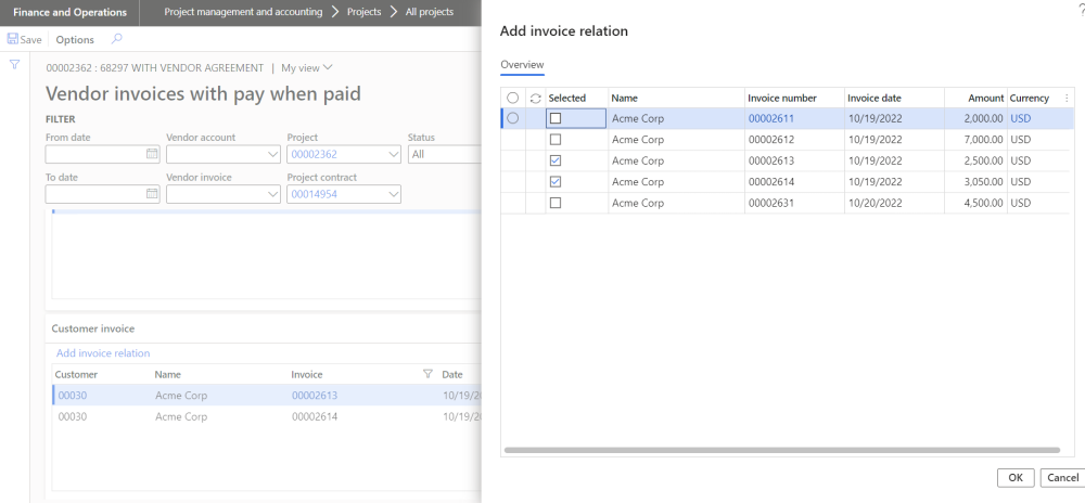 In this enhancement, multiple customer invoices can be linked to multiple vendor invoices and the opposite, multiple customer invoices can be linked to multiple vendor invoices through “Vendors pay when paid” form.