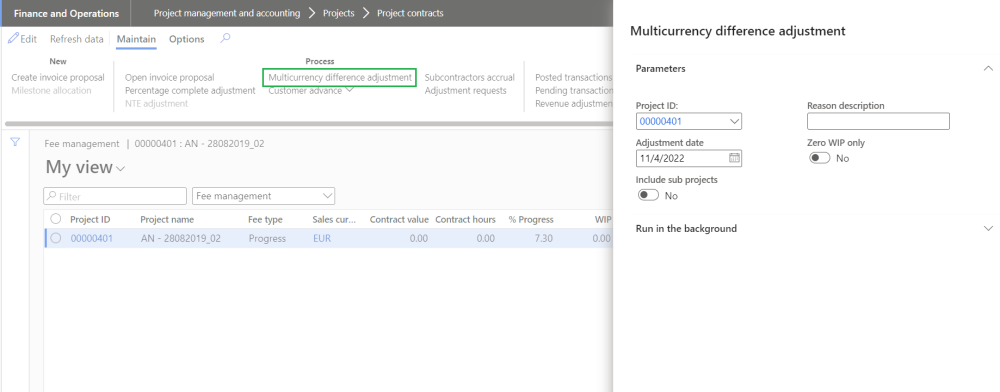 This new feature is providing a new revenue adjustment type to adjust variances between WIP (work-in-progress) in contract currency vs WIP in accounting currency. These multicurrency difference happen due to the currency exchange rate fluctuations during the project life cycle.