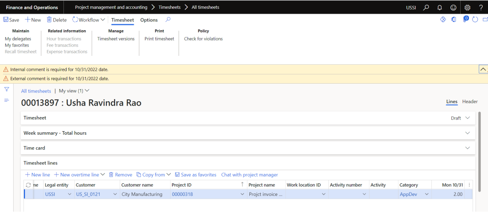 In this enhancement, validations related to “Mandatory external/internal comments” will be displayed as a warning message during timesheet entry instead of as an action message after workflow submission.