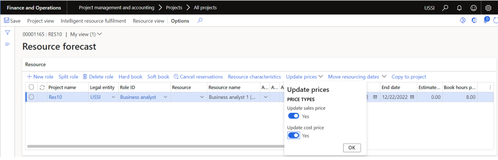 In this enhancement, new button “Update prices” is introduced where user can update the Sales/Cost prices from the price configuration for the selected resource forecast record. Also, this new capability will allow users to manually enter Sales/Cost prices on this form without automatically always getting overwritten.